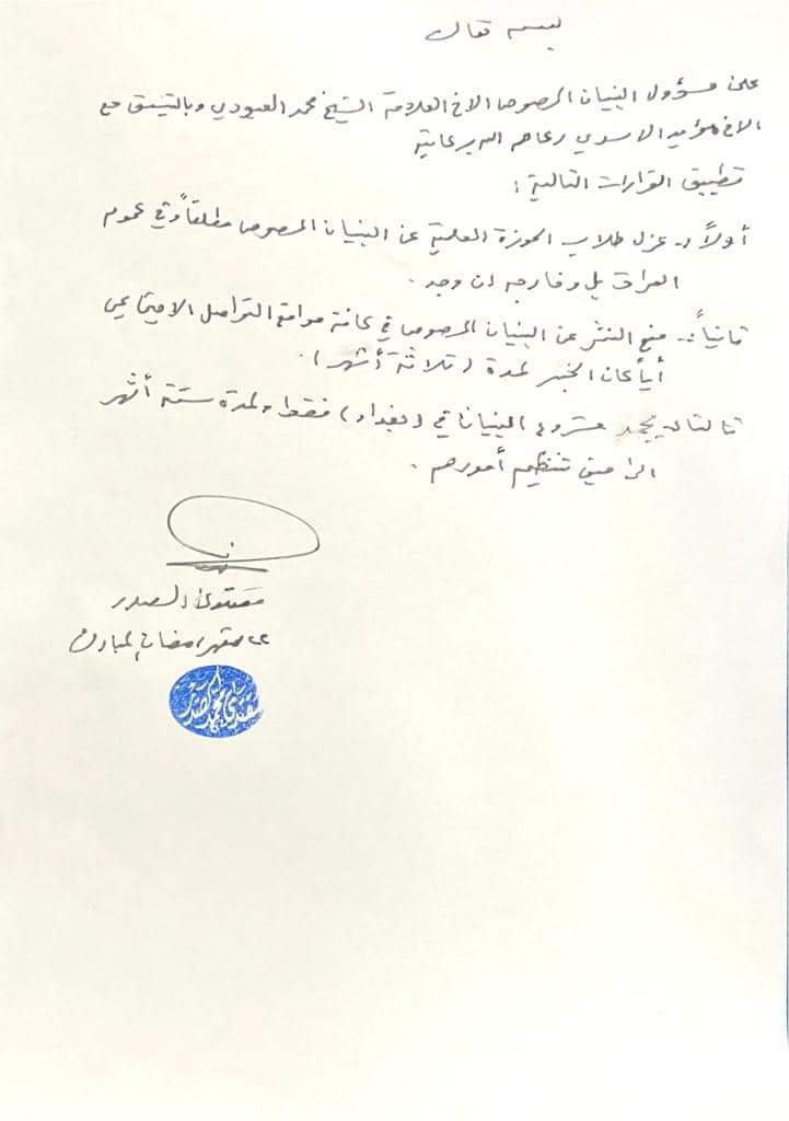وقرر الصدر في التوجيه بحسب وثيقة ادناه نصها، منع النشر في مواقع التواصل الاجتماعي لمدة ثلاثة اشهر وتجميد المشروع في بغداد لمدة ستة اشهر.