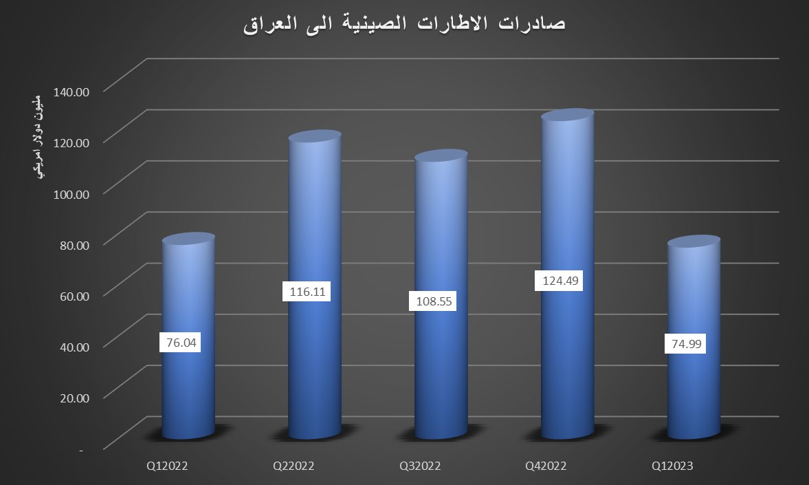 وقال العبيدي في تدوينة تابعتها السومرية نيوز، ان “قيمة الصادرات الصينية في الربع الاول من 2023 بلغت بحدود 1.9 مليون إطار وبقيمة 75 مليون دولار متراجعة بنسبة 39% مقارنة مع الربع الرابع من 2022 والذي بلغ بحدود 2.8 مليون إطار وبقيمة 125 مليون دولار ومتراجعا عن الربع الاول من 2022 وبنسبة 1.38%، حيث بلغت اعداد الاطارات المستوردة 2.12 مليون إطار وبقيمة 76 مليون دولار امريكي “.