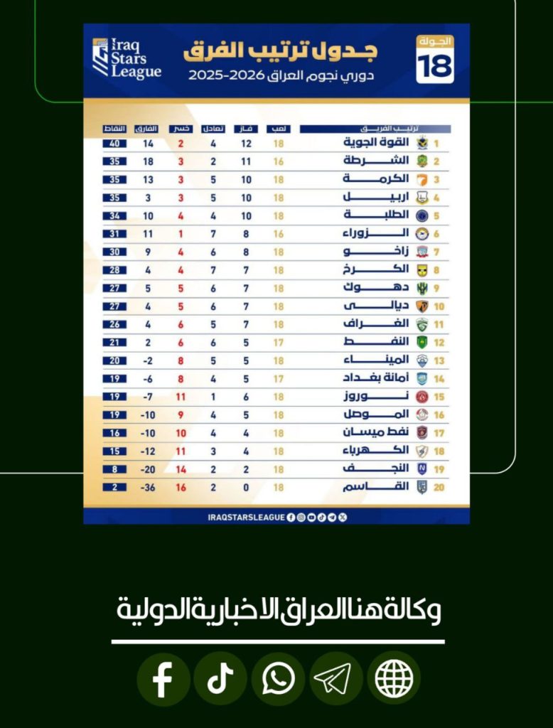 ترتيب الفرق بدوري نجوم العراق بعد نهاية الجولة (18)