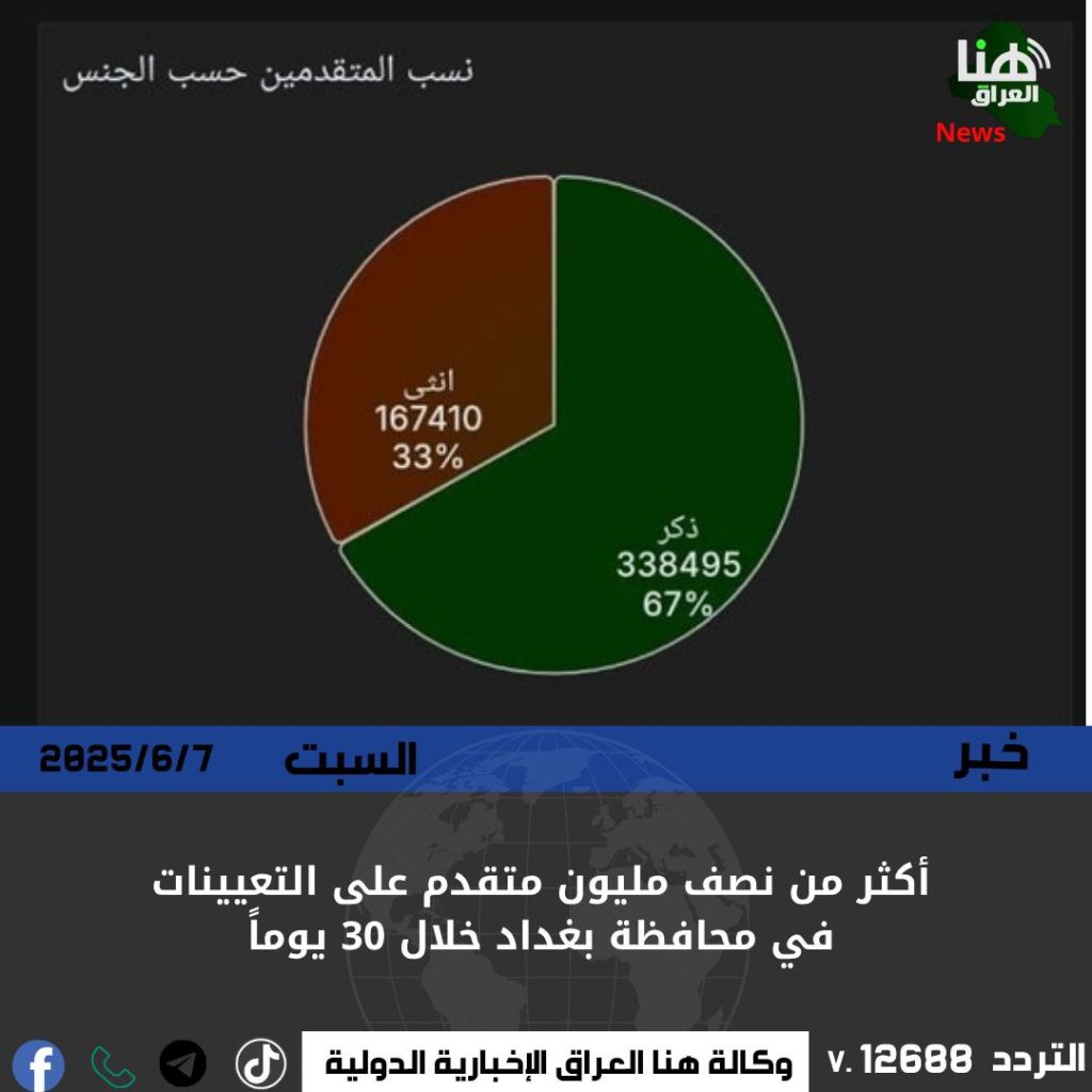 وتوزعت الطلبات بواقع 282,504 في جانب الرصافة، و223,401 في جانب الكرخ، فيما بلغت نسبة الذكور 338,495، والإناث 167,410. وسجّل قطاع الحِرف النسبة الأعلى من المتقدمين بواقع 86,634، تلاه الاختصاص الأدبي/كاتب بـ44,044، ثم حارس ثاني بـ30,927 متقدماً.