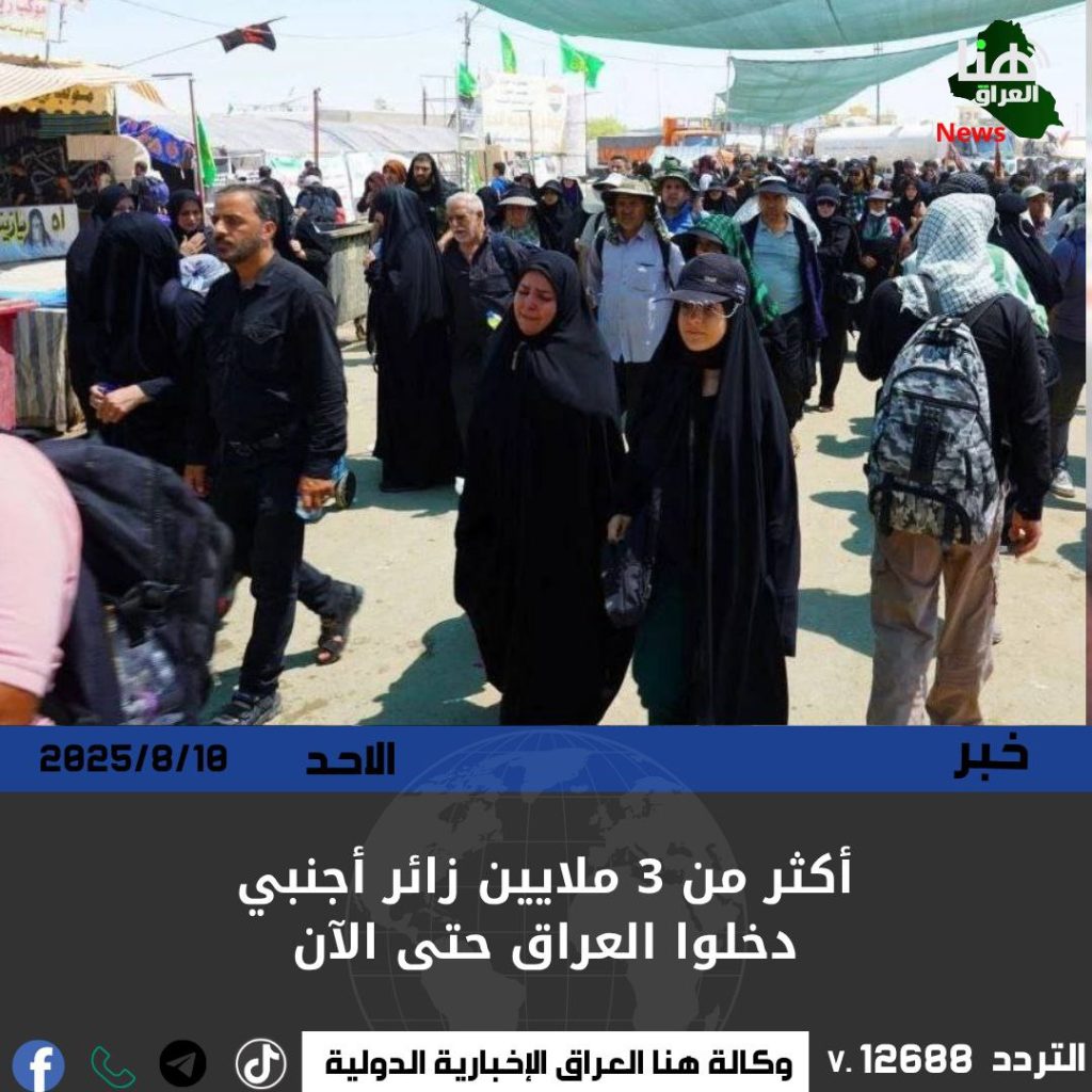 أعلن رئيس هيئة المنافذ الحدودية، الفريق عمر الوائلي، دخول أكثر من ثلاثة ملايين زائر أجنبي إلى العراق حتى الآن، مقابل مغادرة مليون زائر.
