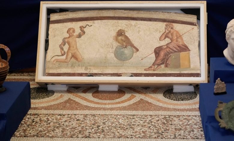 عادت لوحة جدارية تصور هرقل يعود أصلها لمدينة “هركولانيوم” الرومانية القديمة جنوبي إيطاليا القريبة من بومبي والتي دمرت معها في ثورن بركان فيزوف عام 79 ميلادية- إلى إيطاليا، اضافة الى 59 قطعة أثرية أخرى تم تهريبها بشكل غير قانوني إلى الولايات المتحدة.