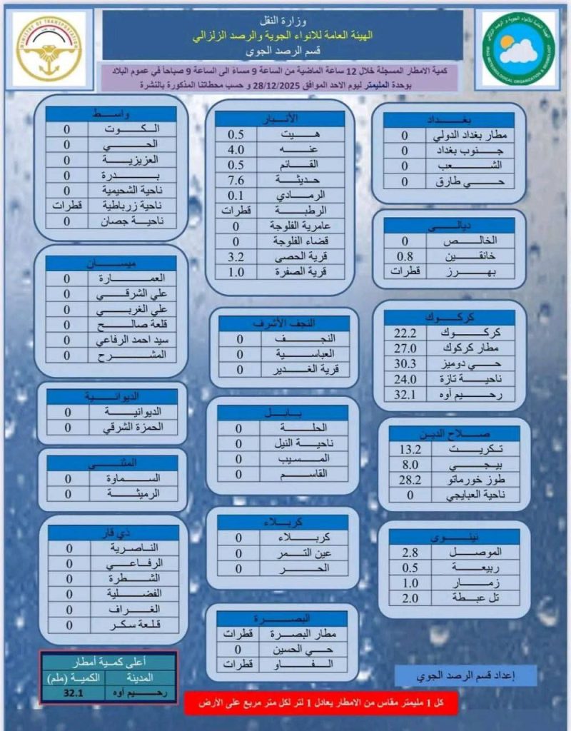 إحصائية للأنواء الجوية توضح كمية الامطار المتساقطة على البلاد خلال ال 12 ساعة الماضية