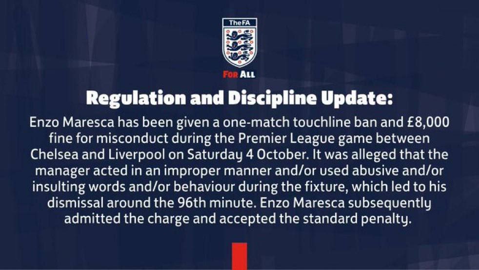 الرئيسية/رياضة/إيقاف إنزو ماريسكا لمباراة واحدة وغرامة قدرها 8000 جنيه إسترليني بعد الطرد الذي تعرض له خلال مباراة ليفربول. رياضة إيقاف إنزو ماريسكا لمباراة واحدة وغرامة قدرها 8000 جنيه إسترليني بعد الطرد الذي تعرض له خلال مباراة ليفربول. شاركها فيسبوك X لينكدإن Tumblr بينتيريست Reddit VKontakte Odnoklassniki Pocket مشاركة عبر البريد طباعة