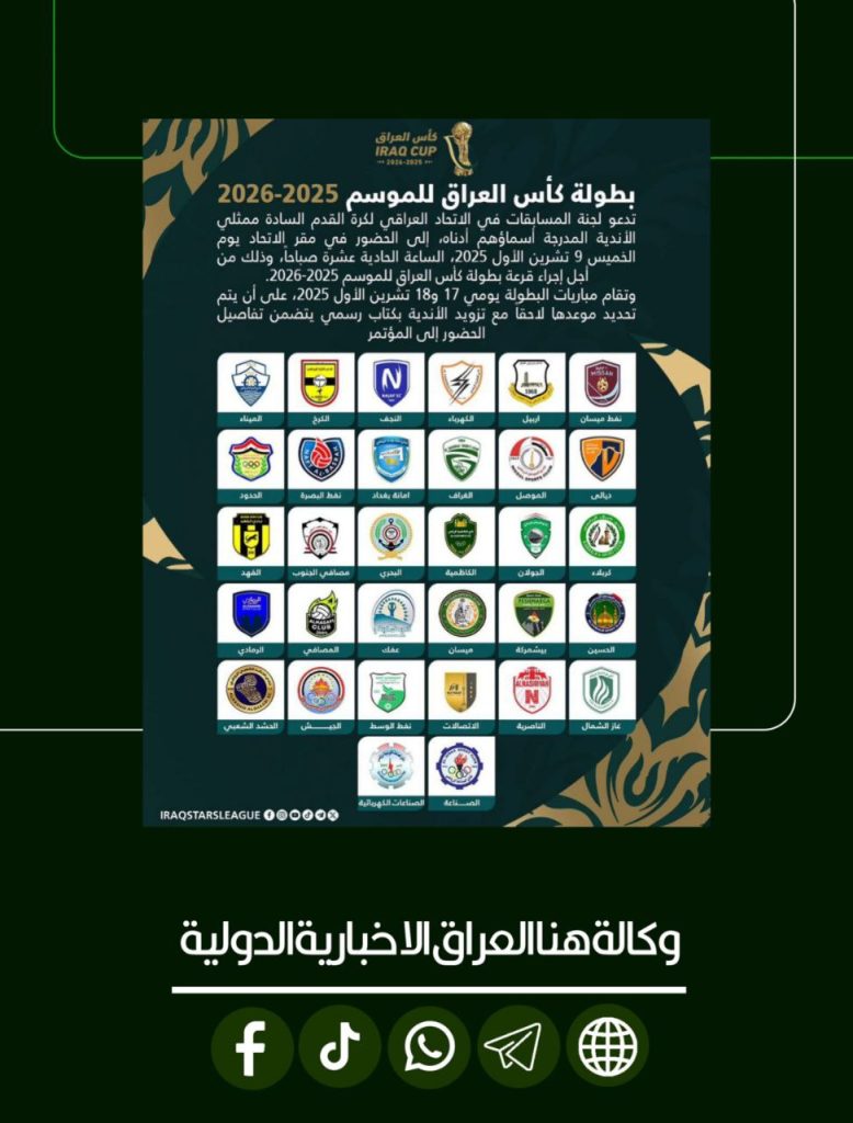 الرئيسية/رياضة/اتحاد الكرة يحدد الخميس موعداً لإجراء قرعة بطولة كأس العراق للموسم 2025–2026 رياضة اتحاد الكرة يحدد الخميس موعداً لإجراء قرعة بطولة كأس العراق للموسم 2025–2026 شاركها فيسبوك X لينكدإن Tumblr بينتيريست Reddit VKontakte Odnoklassniki Pocket مشاركة عبر البريد طباعة