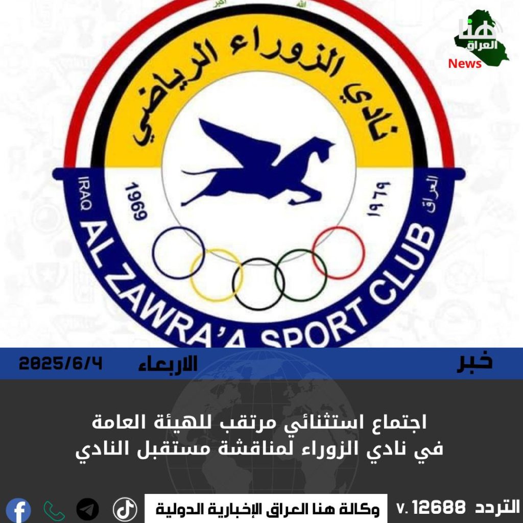 أعلن نادي الزوراء الرياضي عن عقد اجتماع استثنائي للهيئة العامة، يوم غد الخميس، استناداً إلى قانون الأندية الرياضية رقم 18 لسنة 1986 المعدل.