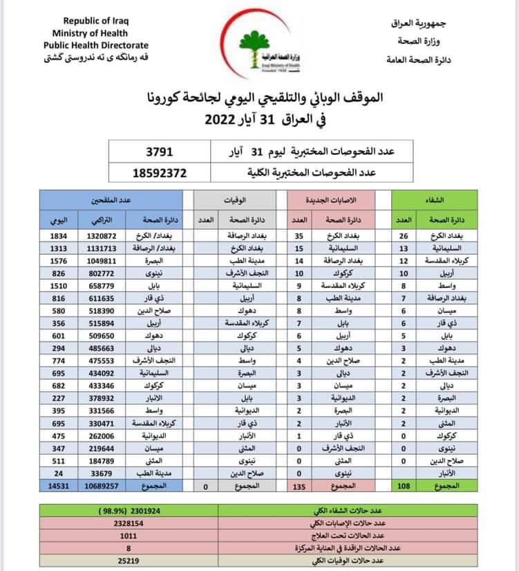 أعلنت وزارة الصحة، اليوم الثلاثاء، الموقف الوبائي اليومي الخاص بجائحة كورونا في عموم العراق.