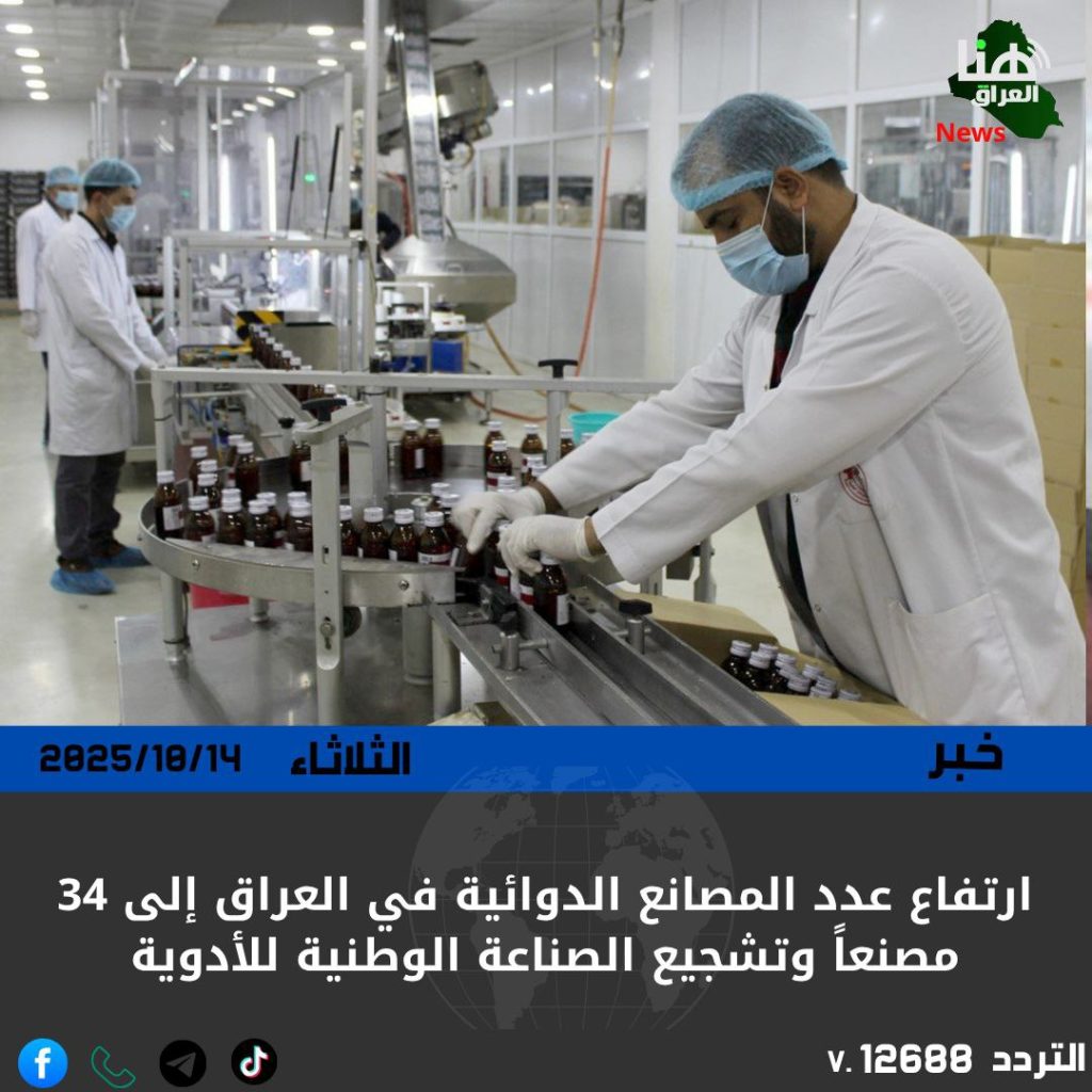 أعلن مستشار رئيس الوزراء لشؤون الصناعة والتنمية، حمودي اللامي، ارتفاع عدد المصانع العاملة في القطاع الدوائي من 22 إلى 34 مصنعاً تعمل بكامل طاقتها الإنتاجية.