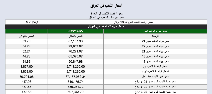 اسعار الذهب في الاسواق المحلية العراقية ليوم الجمعة.