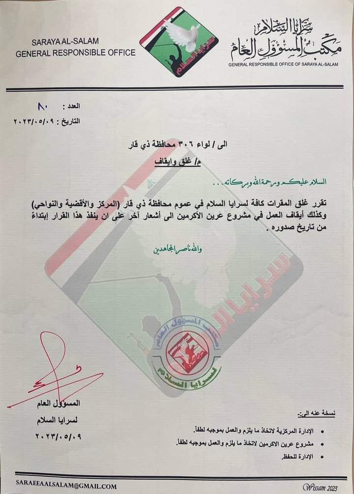 اغلاق جميع مقرات سرايا السلام في ذي قار (وثيقة)