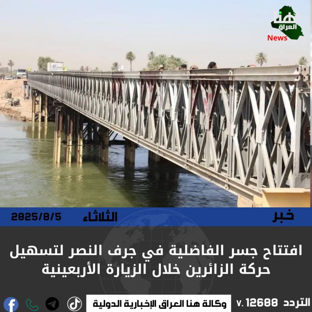أعلنت الجهات المعنية عن افتتاح جسر الفاضلية في منطقة جرف النصر أمام حركة العجلات والزوار ذهاباً وإياباً، وذلك ضمن تنفيذ خطة الزيارة الأربعينية، بهدف تأمين انسيابية المرور وتقليل الزخم في الطرق المؤدية إلى كربلاء المقدسة.