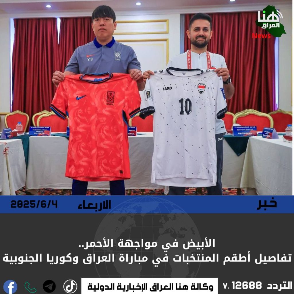 أعلن الاتحاد العراقي لكرة القدم أن منتخب العراق سيرتدي الزي الأبيض الكامل في مباراته المرتقبة أمام منتخب كوريا الجنوبية، بينما سيرتدي حارس المرمى العراقي الزي الأصفر.