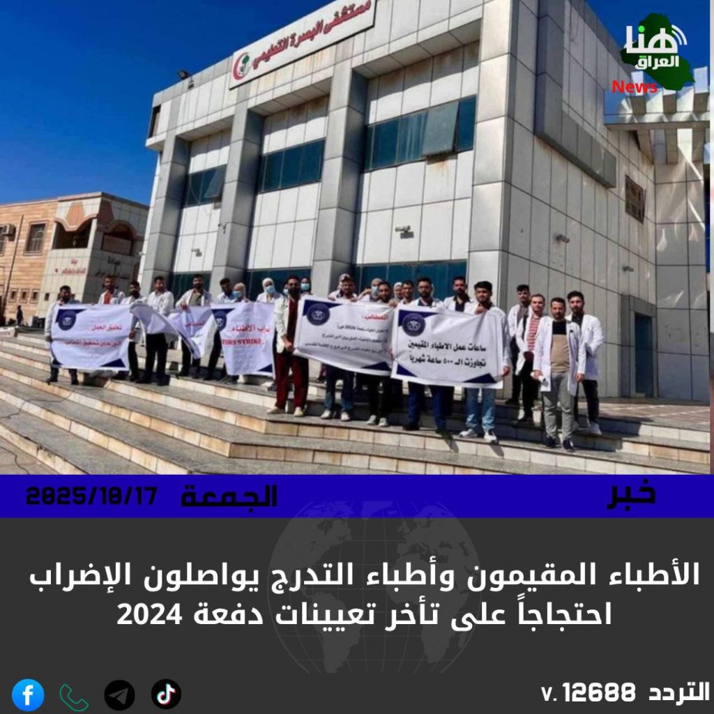 يواصل الأطباء المقيمون وأطباء التدرج في العراق إضرابهم عن العمل احتجاجاً على تأخر إطلاق التعيينات الجديدة لدفعة عام 2024، ما أدى إلى تعطيل مسار التدرج الطبي وزيادة الضغط وساعات العمل على المقيمين الدوريين في المستشفيات.