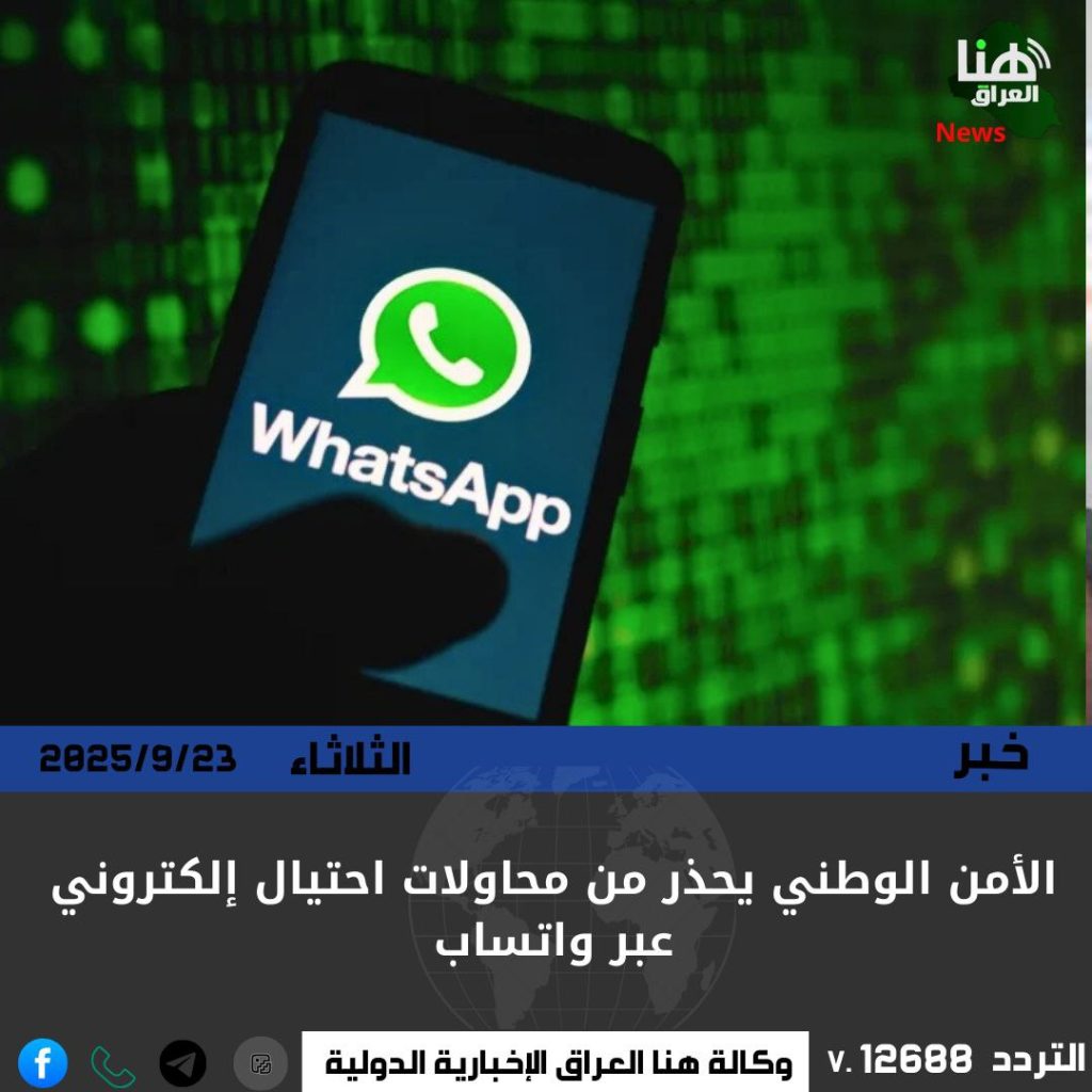 حذر جهاز الأمن الوطني العراقي من محاولات احتيال إلكتروني تستهدف المواطنين عبر تطبيق “واتساب”، من خلال استدراجهم لتمرير رمز التحقق الخاص بالتطبيق، ما يتيح للمهاجمين السيطرة على الحسابات واستخدامها في طلب الأموال وسرقة بيانات البطاقات الائتمانية ونشر روابط خبيثة.