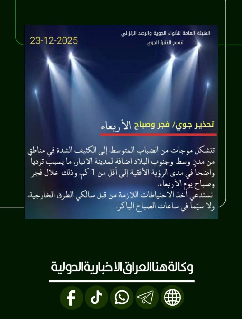 الرئيسية/الطقس/الأنواء تحذر من موجة ضباب تجتاح مدن العراق الأربعاء الطقس الأنواء تحذر من موجة ضباب تجتاح مدن العراق الأربعاء شاركها فيسبوك X لينكدإن Tumblr بينتيريست Reddit VKontakte Odnoklassniki Pocket مشاركة عبر البريد طباعة