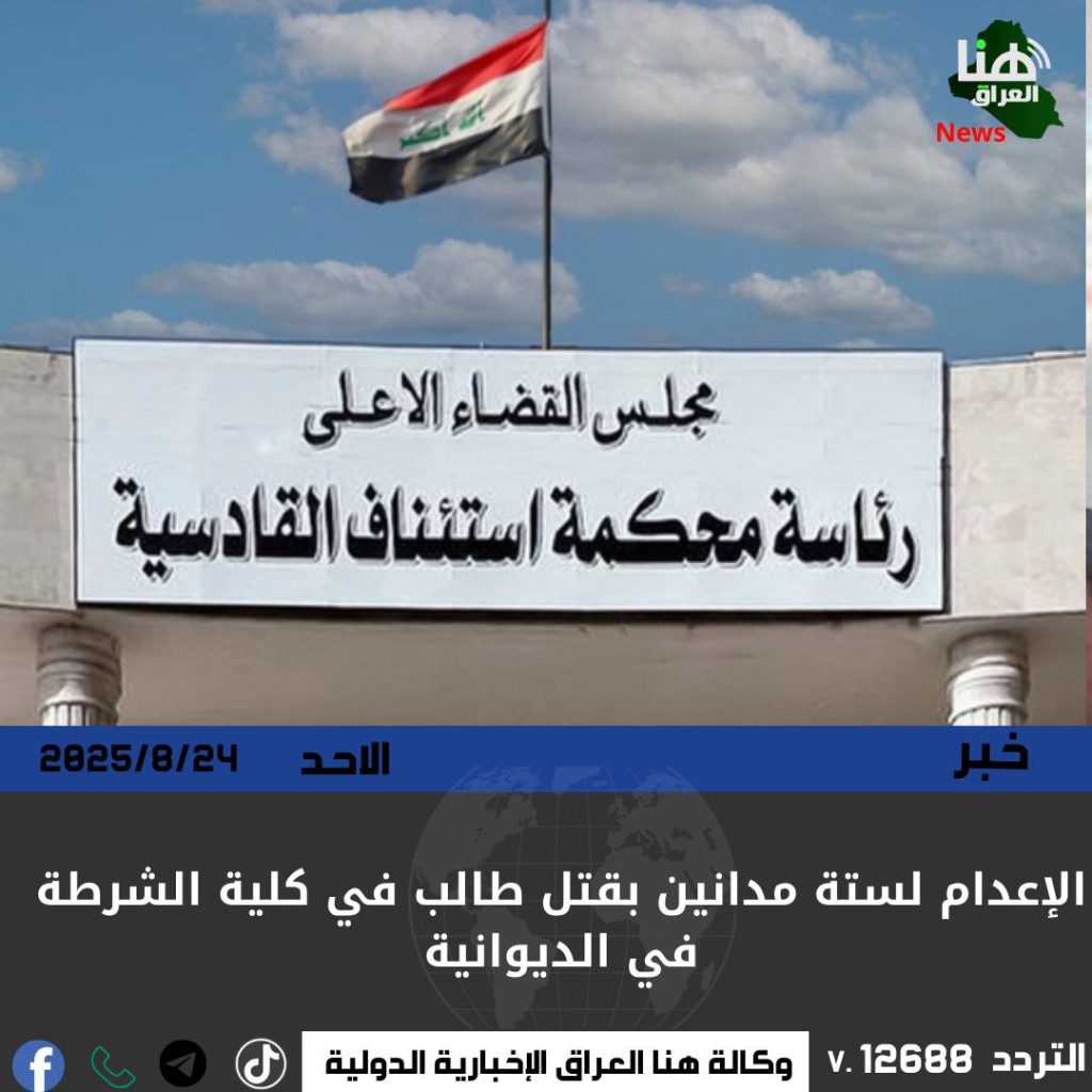 أصدرت محكمة جنايات القادسية في الديوانية، اليوم الأحد، حكمًا بالإعدام بحق ستة مدانين بقتل طالب كلية الشرطة أمير الخالدي أثناء عودته إلى منزله، إثر خلافات عشائرية.