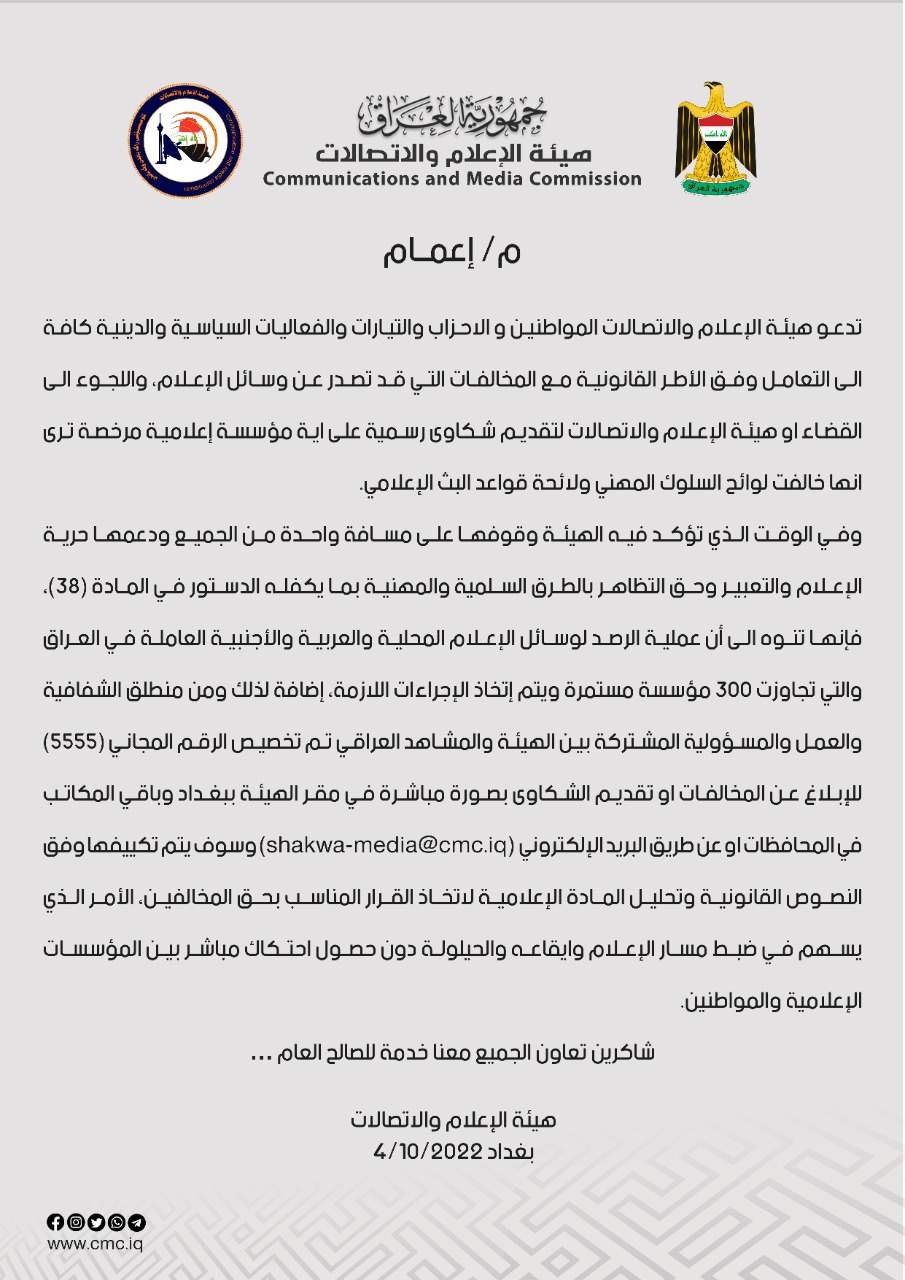 ودعت الهيئة في بيان ادناه نصه، “المواطنين والاحزاب والتيارات والفعاليات السياسية والدينية كافة الى التعامل وفق الاطر القانونية مع المخالفات التي قد تصدر من وسائل الإعلام”.