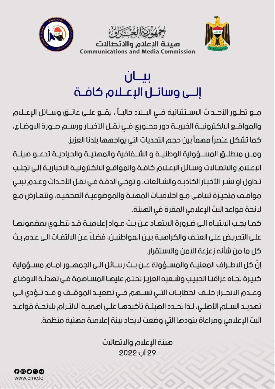 كما دعت الهيئة في بيان لها الى “تجنب تداول او نشر الاخبار الكاذبة والشائعات وتوخي الدقة في نقل الاحداث”.