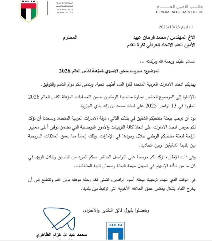 الرئيسية/رياضة/الاتحاد الإماراتي لكرة القدم في رسالة لنظيره العراقي يُرحب بالمنتخب العراقي في الإمارات و يؤكد تسهيل كافة الأمور المطلوبة قبل الملحق الاسيوي وذلك تأكيداً لعمق العلاقة الاخوية التي تربط البلدين. رياضة الاتحاد الإماراتي لكرة القدم في رسالة لنظيره العراقي يُرحب بالمنتخب العراقي في الإمارات و يؤكد تسهيل كافة الأمور المطلوبة قبل الملحق الاسيوي وذلك تأكيداً لعمق العلاقة الاخوية التي تربط البلدين. شاركها فيسبوك X لينكدإن Tumblr بينتيريست Reddit VKontakte Odnoklassniki Pocket مشاركة عبر البريد طباعة