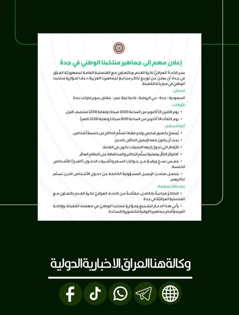 الاتحاد العراقي لكرة القدم يعلن بالتعاون مع القنصلية العراقية في جدة، عن توزيع تذاكر مجانية لجماهير منتخبنا الوطني لدعم مؤازرتهم للمنتخب في مبارياته المقبلة