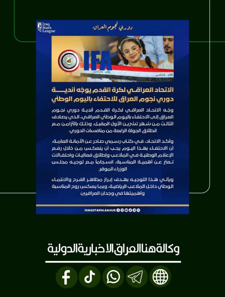 الرئيسية/رياضة/الاتحاد العراقي لكرة القدم يوجّه أندية دوري نجوم العراق للاحتفاء باليوم الوطني برفع الاعلام وتنظيم فعاليات احتفالية. رياضة الاتحاد العراقي لكرة القدم يوجّه أندية دوري نجوم العراق للاحتفاء باليوم الوطني برفع الاعلام وتنظيم فعاليات احتفالية. شاركها فيسبوك X لينكدإن Tumblr بينتيريست Reddit VKontakte Odnoklassniki Pocket مشاركة عبر البريد طباعة