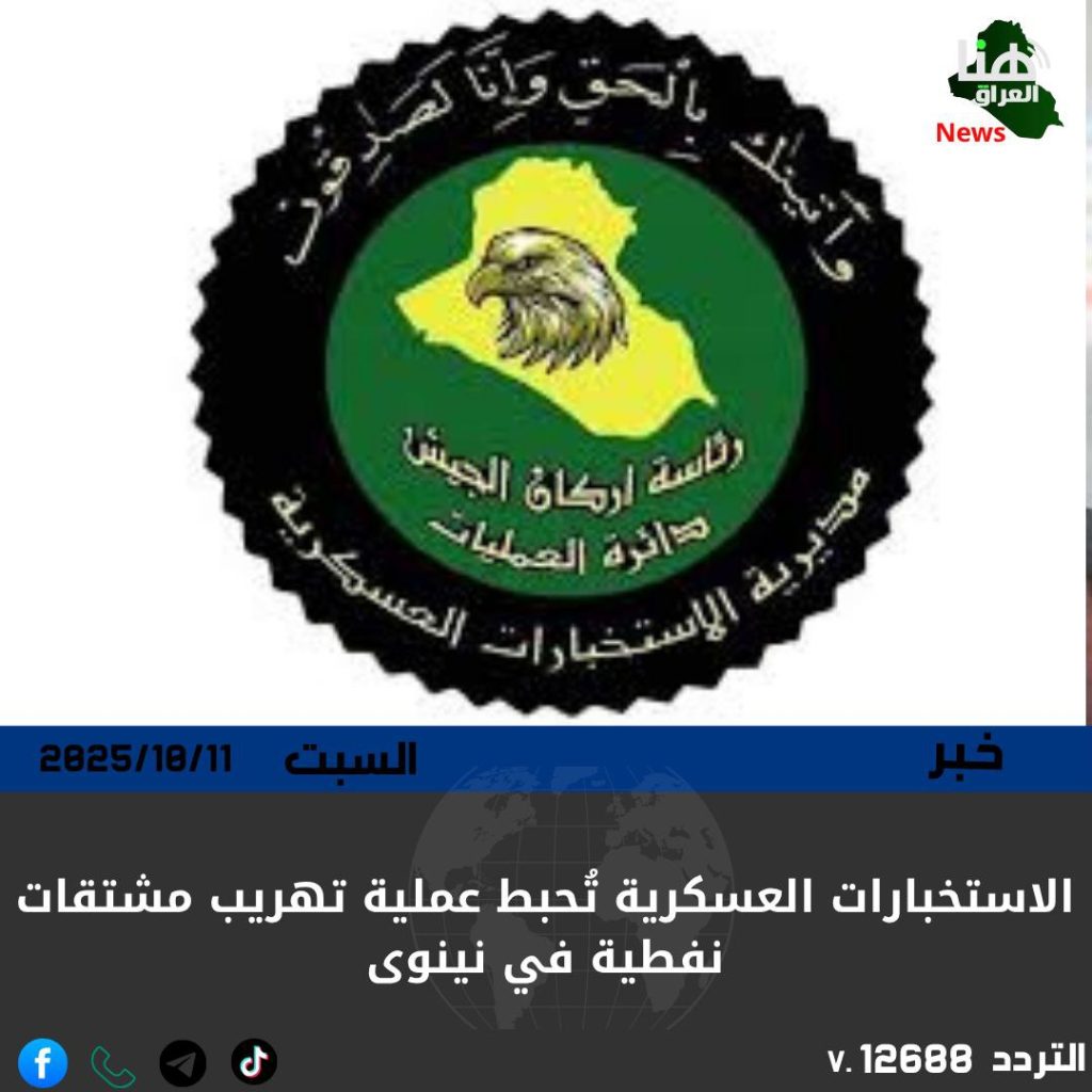 أعلنت مديرية الاستخبارات العسكرية عن إحباط عملية لتهريب المشتقات النفطية على طريق مخمور في محافظة نينوى، بعد تنفيذ عملية نوعية بالتنسيق مع الجهات الأمنية.
