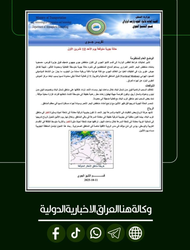 الانواء الجوية توضح بشأن الحالة المطرية: تنحصر في محافظات نينوى ودهوك وشمال أربيل وتنحسر ظهر الاثنين
