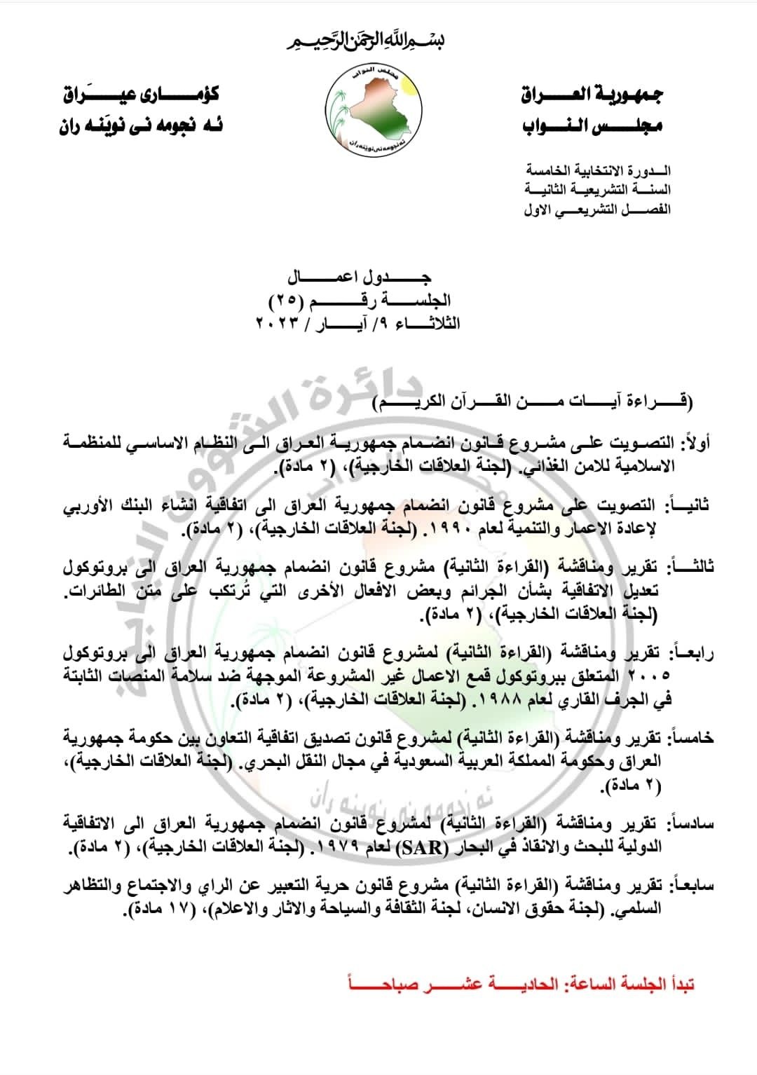 ادناه وثيقة جدول اعمال جلسة اليوم: ـ
