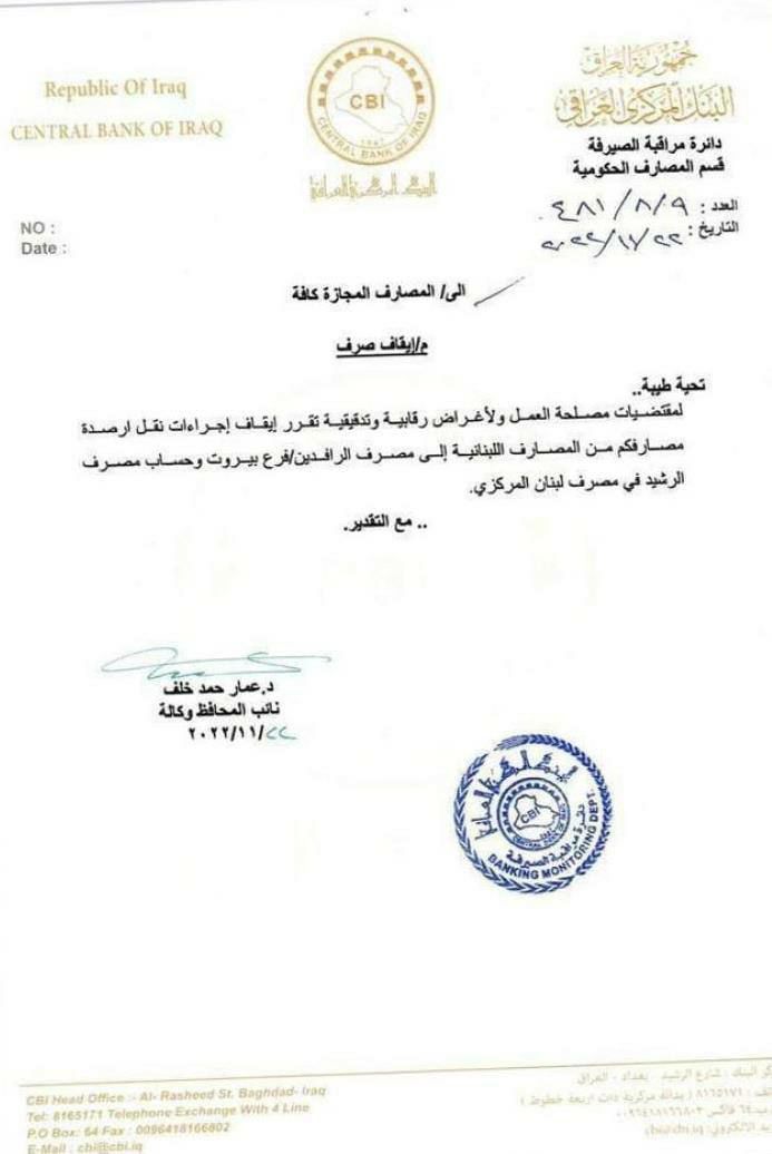 وأظهرت وثيقة قرار البنك المركزي العراقي الموجّه إلى المصارف العراقية كافة، أنه “لمقتضيات مصلحة العمل ولأغراض رقابية وتدقيقية تقرر إيقاف إجراءات نقل الأرصدة من المصارف اللبنانية إلى مصرف الرافدين فرع بيروت، وحساب مصرف الرشيد المركزي في مصرف لبنان المركزي“.