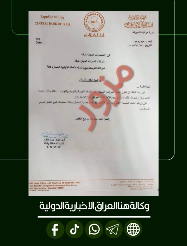 البنك المركزي ينفي رفع حصة المسافر من الدولار إلى 5 آلاف شهرياً ويؤكد الكتاب المتداول في مواقع التواصل الاجتماعي “مزور”