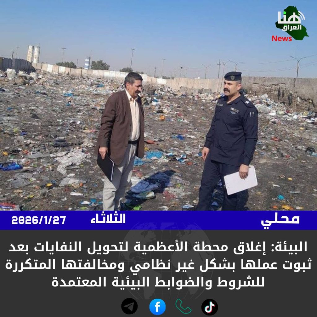 البيئة: إغلاق محطة الأعظمية لتحويل النفايات بعد ثبوت عملها بشكل غير نظامي ومخالفتها المتكررة للشروط والضوابط البيئية المعتمدة