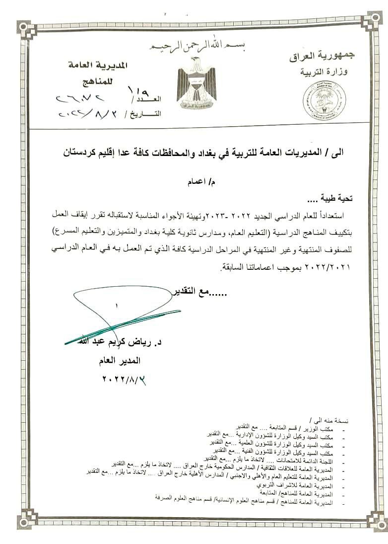 واضافت، أن “المديرية العامة للمناهج اصدرت إعماماً إلى المديريات العامة للتربية في بغداد والمحافظات يقضي بإيقاف العمل بـ”تكييف المناهج الدراسية” (التعليم العام ، مدارس ثانوية بغداد والمتميزين ، التعليم المسرع) للصفوف المنتهية وغير المنتهية في المراحل الدراسية كافة، الذي تم العمل به في العام الدراسي 2021 – 2022 “.