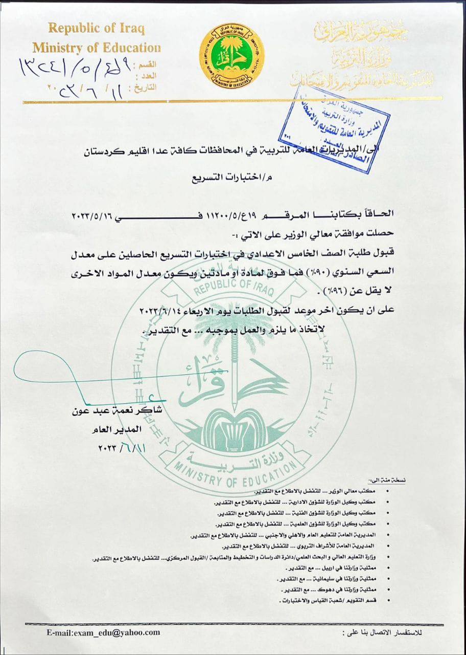 وبحسب وثيقة وردت من وزارة التربية، وحصلت عليها فإنه “إلحاقاً بكتابنا المرقم 19 ع / 5 / 11200 في 16 / 5 / 2023، حصلت موافقة وزير التربية على قبول طلبة صف الخامس الاعدادي في اختبارات التسريع الحاصلين على معدل سعي السنوي (90%) فما فوق لمادة أو مادتين، ويكون المعدل المواد الأخرى لا يقل عن (96 %).