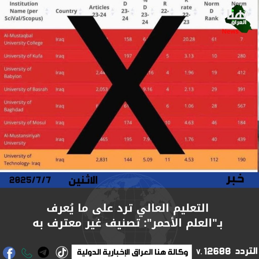 أكد المتحدث باسم وزارة التعليم العالي والبحث العلمي، حيدر العبودي، أن ما يُعرف بـ”مؤشر النزاهة البحثية” أو “العلم الأحمر” لا يمثل تصنيفًا علميًا أو أكاديميًا معتمدًا، مشيرًا إلى أن الجامعات العراقية حققت تقدمًا واضحًا في التصنيفات الدولية.