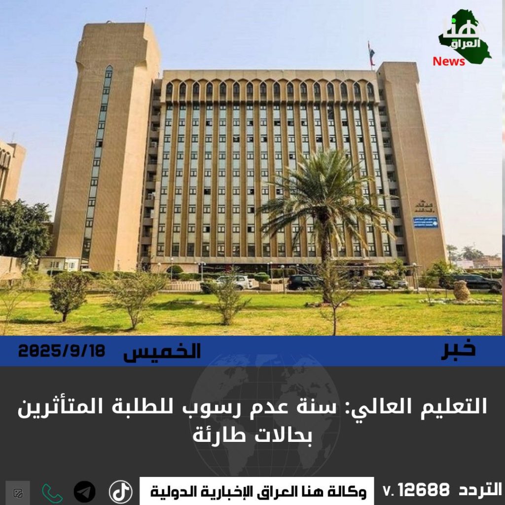 أعلنت وزارة التعليم العالي، يوم الخميس، شمول طلبة المراحل ما قبل المنتهية الذين سيتم ترقين قيدهم للسنة الدراسية 2025/2024 بسنة عدم رسوب، وذلك لمعالجة الحالات الطارئة التي حالت دون تمكنهم من اجتياز السنة الدراسية بنجاح.