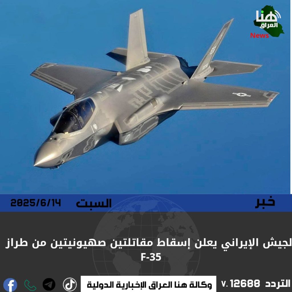 أعلنت قيادة الجيش الإيراني أن الدفاعات الجوية أسقطت طائرتين حربيتين من طراز F-35 تابعتين للكيان الصهيوني، خلال تصديها لهجوم استهدف مواقع داخل الأراضي الإيرانية، مؤكدة أن الدفاعات الجوية في حالة جاهزية قصوى.