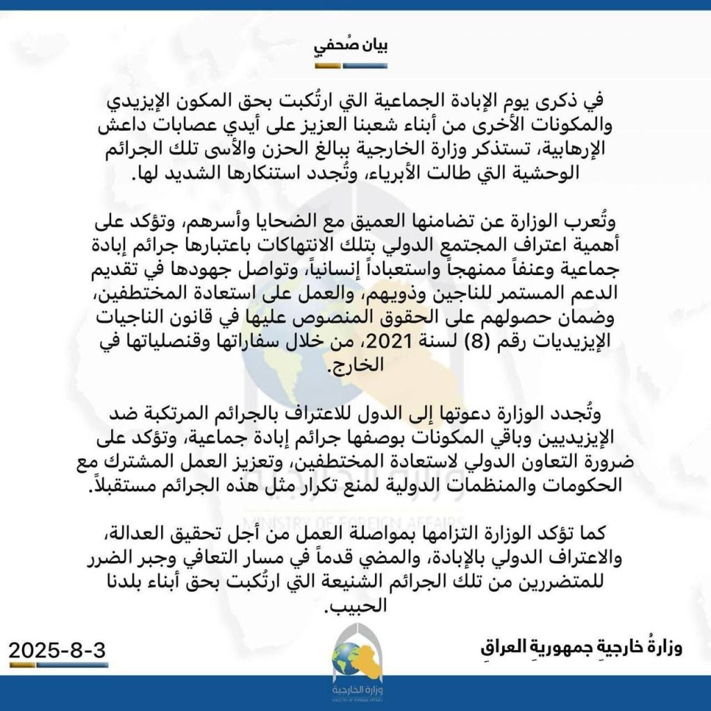 الرئيسية/دولي/الخارجية تطالب مجددًا باعتراف دولي بإبادة الإيزيديين على يد داعش دوليسياسةمحلي الخارجية تطالب مجددًا باعتراف دولي بإبادة الإيزيديين على يد داعش شاركها فيسبوك X لينكدإن Tumblr بينتيريست Reddit VKontakte Odnoklassniki Pocket مشاركة عبر البريد طباعة