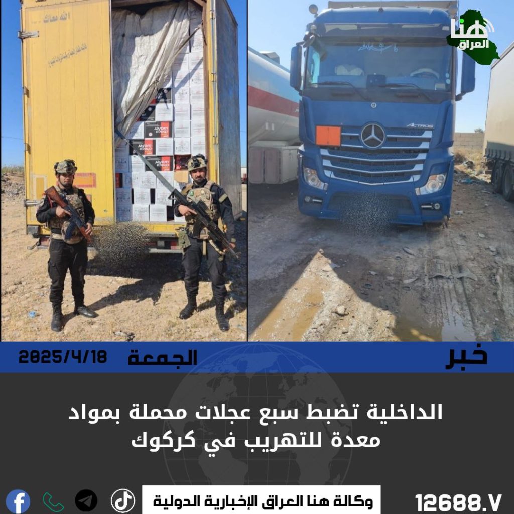 أعلنت وزارة الداخلية، ضبط (7) عجلات محملة بمواد مخالفة ومعدة للتهريب في محافظة كركوك، ضمن سلسلة إجراءات لملاحقة المهربين وتعزيز الأمن الاقتصادي