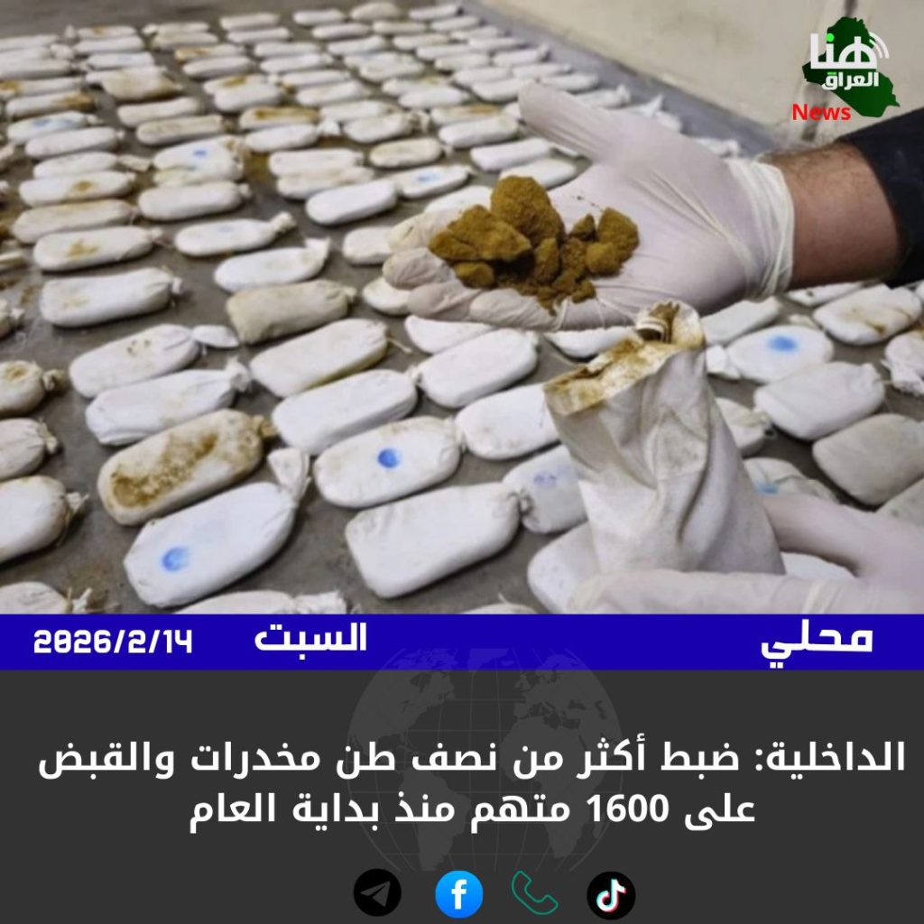 أعلنت وزارة الداخلية، اليوم السبت، حصيلة نشاطات المديرية العامة لشؤون المخدرات والمؤثرات العقلية منذ مطلع العام الحالي، مشيرة إلى ضبط أكثر من نصف طن من المواد المخدرة والقبض على أكثر من 1600 متهم.
