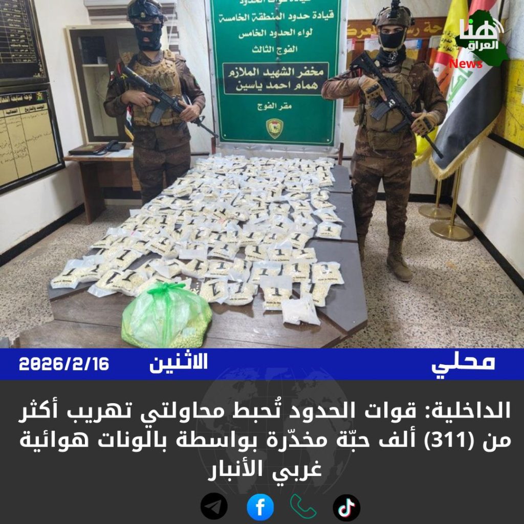 الرئيسية/امن/الداخلية: قوات الحدود تُحبط محاولتي تهريب أكثر من (311) ألف حبّة مخدّرة بواسطة بالونات هوائية غربي الأنبار امنمحلي الداخلية: قوات الحدود تُحبط محاولتي تهريب أكثر من (311) ألف حبّة مخدّرة بواسطة بالونات هوائية غربي الأنبار شاركها فيسبوك X لينكدإن Tumblr بينتيريست Reddit VKontakte Odnoklassniki Pocket مشاركة عبر البريد طباعة