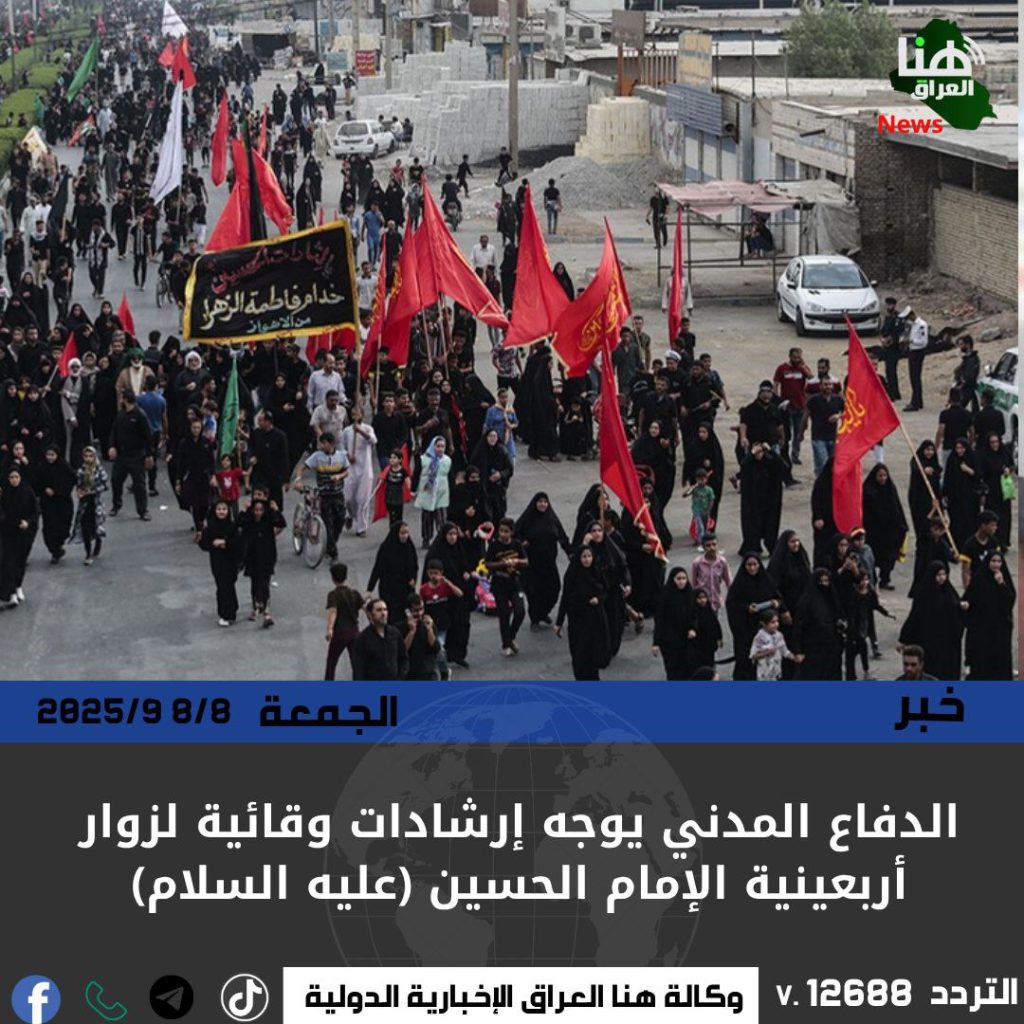 أصدر الدفاع المدني مجموعة من الوصايا لضمان سلامة زوار أربعينية الإمام الحسين، شملت التعامل السليم مع أسطوانات الغاز والتأكد من سلامة التوصيلات الكهربائية، ومنع تخزين الوقود داخل المواكب، وتوفير مطافئ الحريق والتدريب على استخدامها. كما شدد على ضرورة إبعاد مصادر النيران عن الخيام، وتجنب الازدحام في المداخل، والالتزام بالمسارات المحددة من قبل الجهات الأمنية. وحذر من تصديق أو ترويج الشائعات، وأوصى بعدم تناول الأطعمة والمشروبات من مصادر غير معروفة، داعياً إلى الاتصال برقم الطوارئ (911) عند حدوث أي طارئ.