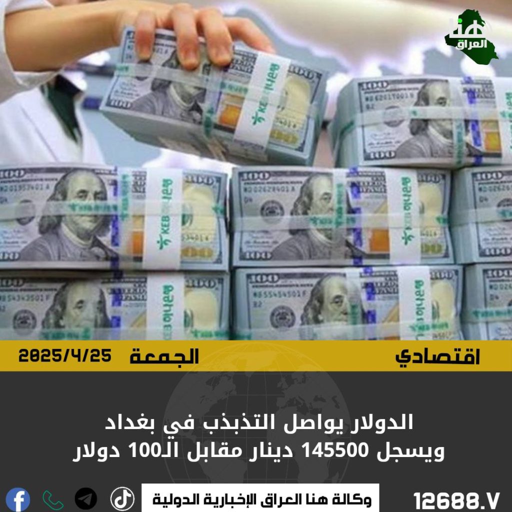 شهدت أسعار صرف الدولار الأمريكي حالة من عدم الاستقرار في بغداد، حيث بلغ سعر البيع 145500 دينار مقابل 100 دولار، وسجل سعر الشراء 144500 دينار.