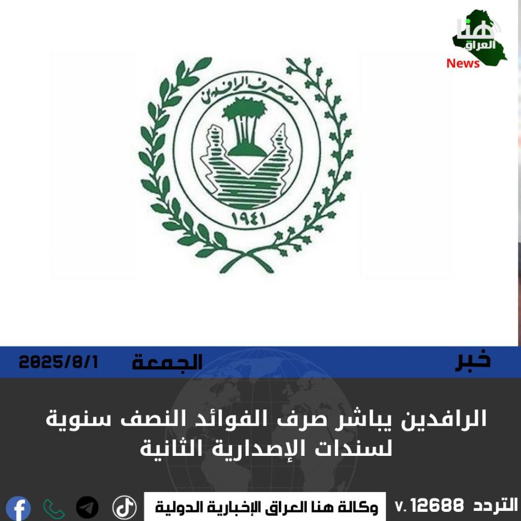 أعلن مصرف الرافدين بدء صرف الفوائد النصف سنوية لحملة الإصدارية الثانية من سندات إنجاز، في إطار التزامه تجاه المستثمرين ودعماً لثقافة الاستثمار بالأدوات المالية الوطنية.