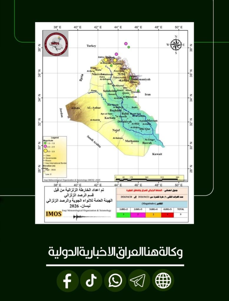 الرصد الزلزالي: تسجيل 9 هزات أرضية للفترة من 21 – 28 نيسان الجاري تراوحت قوتها بين 1.5 الى 3.1 درجة في العراق والمناطق المجاورة