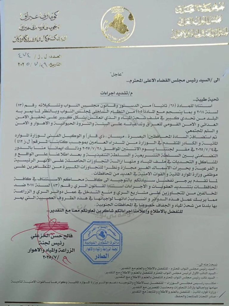 الرئيسية/محلي/الزراعة النيابية: رئيس مجلس القضاء الاعلى وجه رؤساء محاكم الاستئناف بتشديد العقوبات على المتجاوزين للحصص المائية ومنع التدخل في عمل مديريات الموارد المائية والزراعة محلي الزراعة النيابية: رئيس مجلس القضاء الاعلى وجه رؤساء محاكم الاستئناف بتشديد العقوبات على المتجاوزين للحصص المائية ومنع التدخل في عمل مديريات الموارد المائية والزراعة شاركها فيسبوك X لينكدإن Tumblr بينتيريست Reddit VKontakte Odnoklassniki Pocket مشاركة عبر البريد طباعة