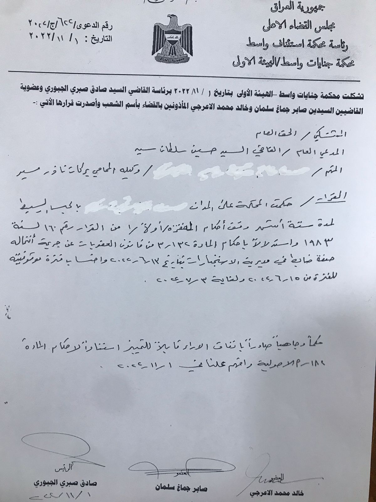 وذكرت المحكمة في بيان ورد لقناة هنا العراق الاخبارية أنه “تم اصدار حكما بالحبس البسيط لمدة ستة أشهر وفق احكام القرار ١٦٠ لسنة ١٩٨٣ النافذ بحق متهم انتحل صفة ضابط في مديرية الاستخبارات من اجل ابتزاز فتاة في مدينة الكوت عن طريق برامج التواصل الاجتماعي”.