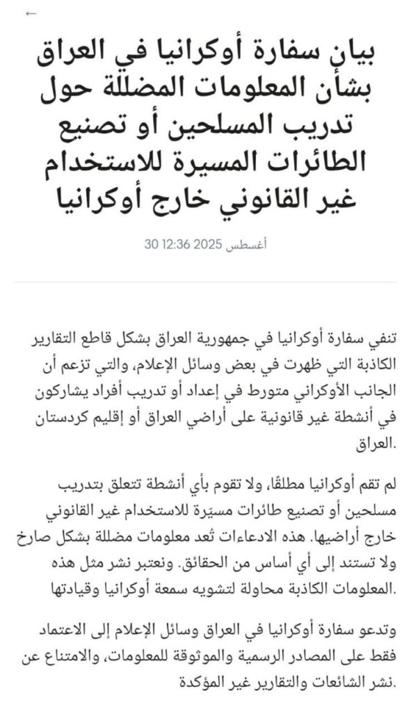 الرئيسية/دولي/السفارة الأوكرانية ترد على التقارير بشأن تدريب مسلحين وتصنيع طائرات مسيرة في السليمانية دولي السفارة الأوكرانية ترد على التقارير بشأن تدريب مسلحين وتصنيع طائرات مسيرة في السليمانية شاركها فيسبوك X لينكدإن Tumblr بينتيريست Reddit VKontakte Odnoklassniki Pocket مشاركة عبر البريد طباعة