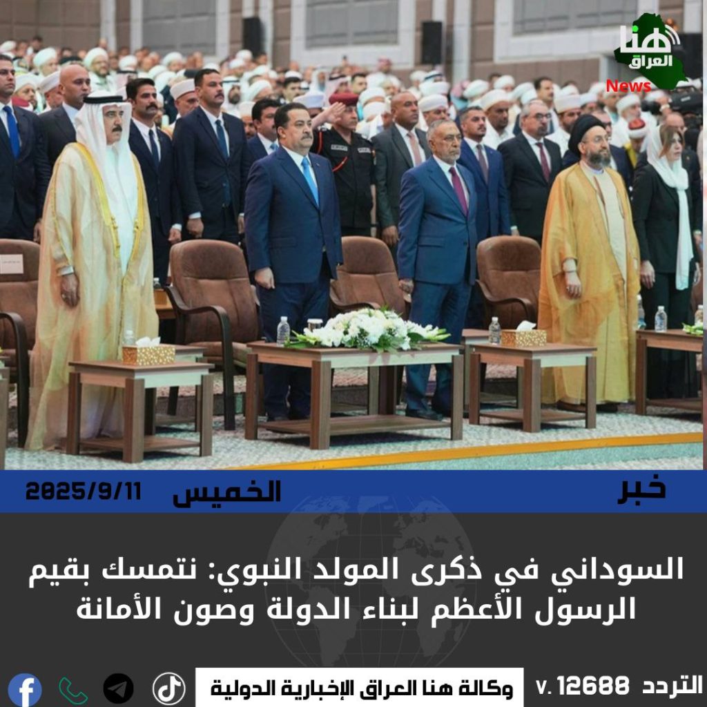 وقال السوداني إن الرسول الأعظم هو النور الذي أضاء عتمة الجاهلية والحبل الممدود من الله للبشرية، مشدداً على أن مشروعه قام على صناعة الإنسان وتثبيت قيم العدل والمساواة.