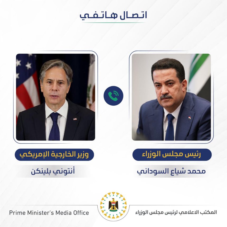 تلقى رئيس مجلس الوزراء محمد شياع السوداني، اليوم الثلاثاء، اتصالاً هاتفياً من وزير الخارجية الأمريكي أنتوني بلينكن، فيما اكد السوداني ضرورة أن تضاعف امريكا والدول الكبرى الجهود لإيقاف الحرب على غزة ولبنان.