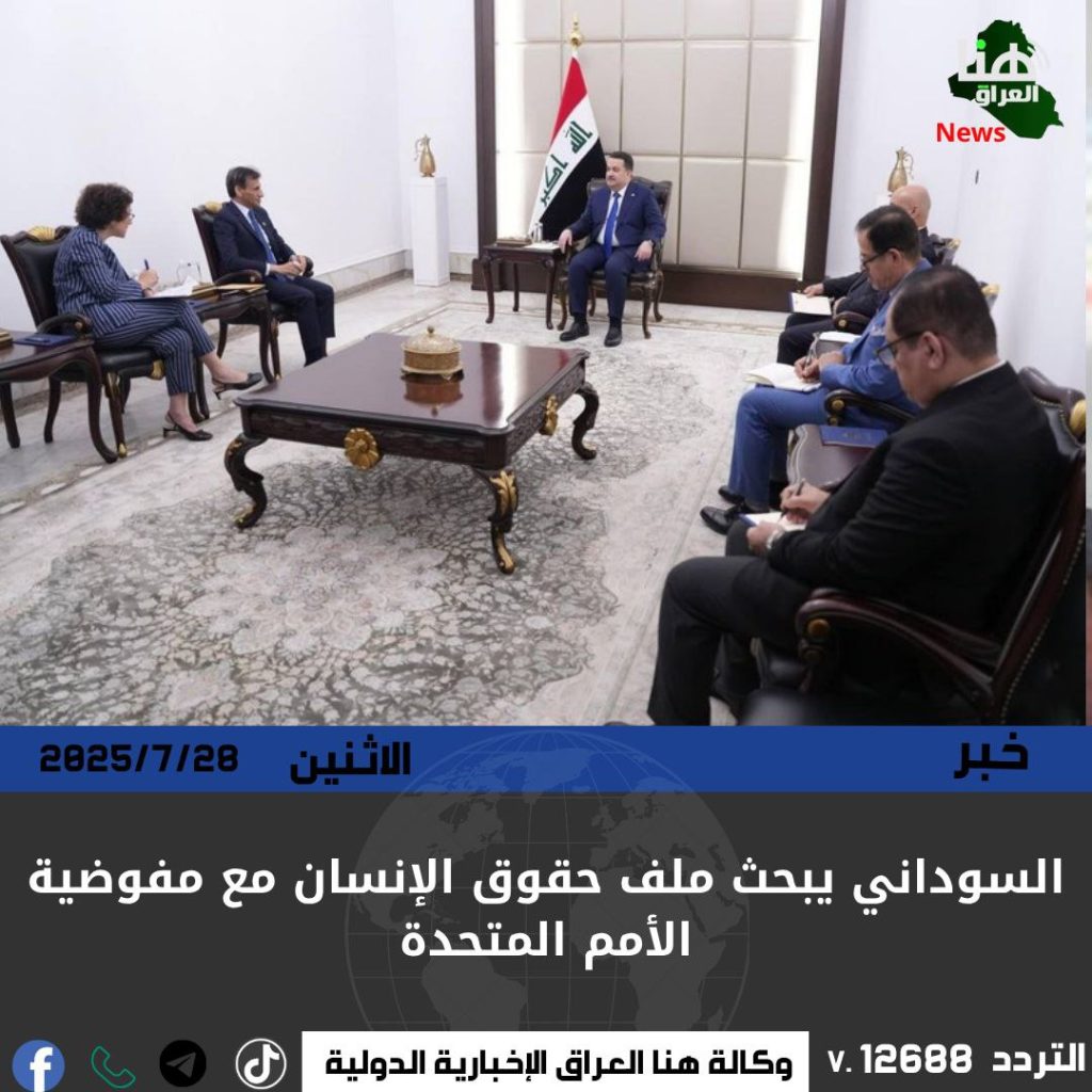 بحث رئيس الوزراء محمد شياع السوداني مع نائبة المفوض السامي لحقوق الإنسان ندى الناشف، سبل تعزيز التعاون بين العراق والمفوضية الأممية، خصوصًا في مجالات الدعم الفني وبناء القدرات.